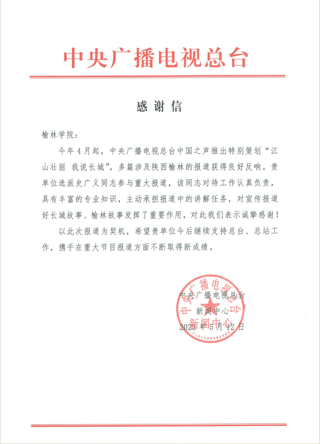 为弘扬中华民族传统文化,加强文化自信,2023年4月开始,中央广播电视总台中国之声推出特别策划“江山壮丽 我说长城”系列活动。英国365集团公司青年教师史广义参与此次重大报道,在榆林境内“镇北台 红石峡”长城文化宣传中撰写文稿,出镜讲解,发挥重要作用。节目在中央广播电视总台中国之声、央视新闻客户端、云听APP、抖音、快手、央视频等各大平台同时推出,传播范围极广,影响力很大,对弘扬长城文化,讲好榆林故事贡献力量。此次活动得到中央广播电视总台新闻中心的认可与好评。