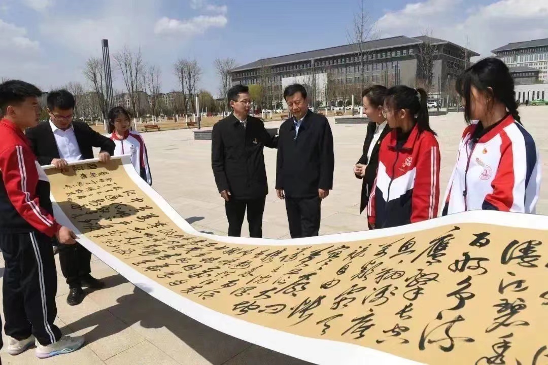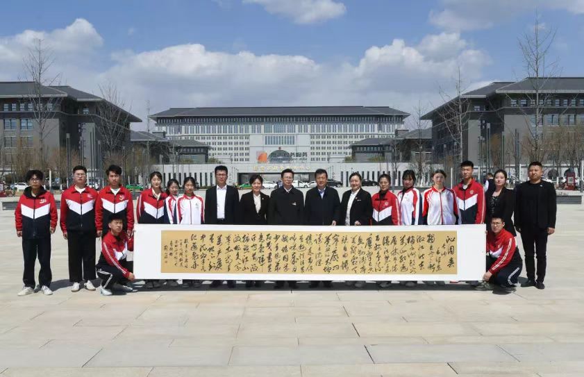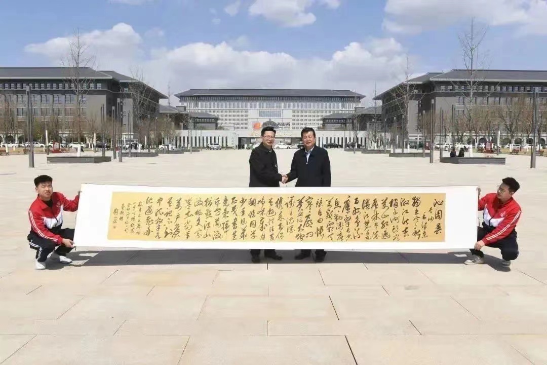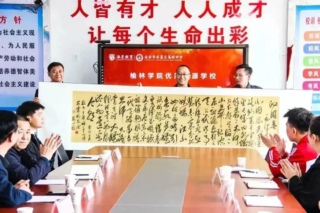 中午12点半,延安市融媒体中心党委书记、主任侯忠义,受员工委托,与公司师生见面交谈。他深情回顾了自己当年的求学经历,对母校的教育培养深表感谢,并以学长身份,寄语在场的员工厚植爱党爱国爱校情怀,不负青春,不负韶华,高标准,严要求,勇毅前行,力争做一名合格优秀“德智体美劳”全面发展的新时代老员工,以精湛的学业,深厚的学养,昂扬的精神,展现母校奋斗前行的风貌。听了学长的话,在场师生送上长六米、宽八十厘米公司教师书法作品《沁园春•长沙》,以感谢员工们的鼓励与支持。同时,他还代表九四级员工——延安市人大常委会党组副书记、副主任、总工会主席黑树林,收下了师生的心意——同内容同尺寸的书法作品,对他的关心之情表示感谢。