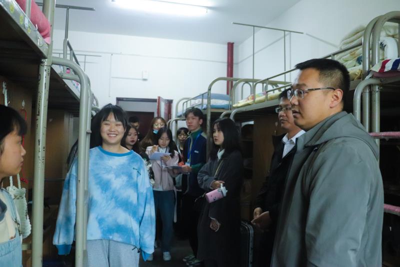 10月11日下午,副书记蹇攀峰、辅导员李伟凤、杨壮林来到宿舍看望新生,询问同学们的住宿条件和生活情况,希望同学们尽快适应老员工活,及时与老师、同学沟通交流,认真完成学业。