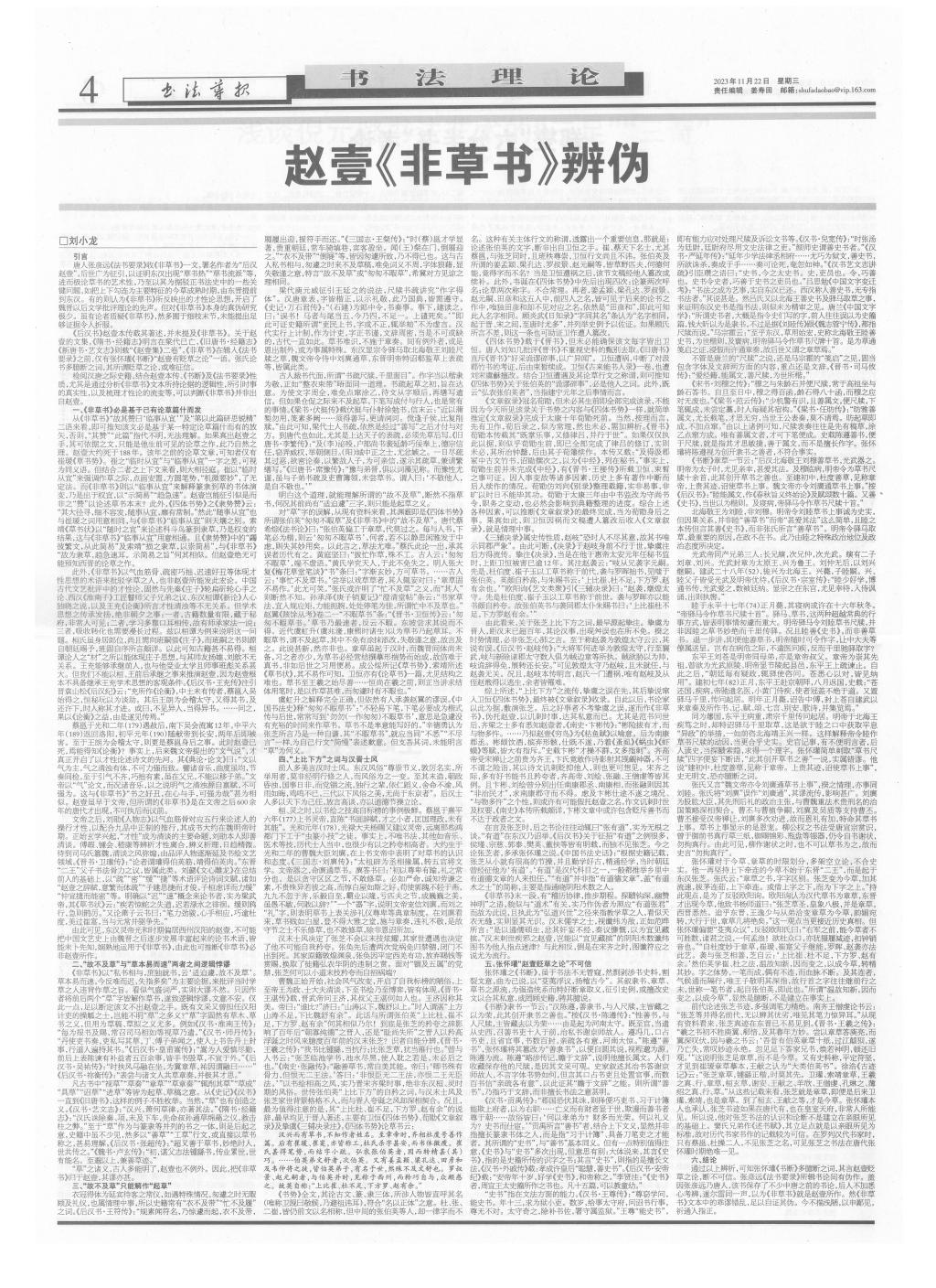 艺术史学家、书法理论家朱中原说:“此文甚佳,大胆立论,小心求证,不蹈袭前人成说,甚为难得。文中立论,认为《非草书》非赵壹所作我甚赞同,盖其行文特征非东汉赵壹时代,而是魏晋间表述。另,文章对张怀瓘《书断》及《法书要录》中有关赵壹之相关论述,我亦赞同。张怀瓘书论确有诸多不可采信之言,尤其采上古神话以为书史,皆不可信,以及张有关篆、隶、八分之起源及创始者之身份等论述,皆不可信,或采择前人半神半史之材料而不加分辨,后之治学者尤须谨慎。该文作者对前人相关论述及史料皆采谨慎态度,而能大胆立论,对前人成说不盲目采信,虽仍有可继续探讨处,但作为一家之新论,不失为一篇非常具有史学价值之书法文献学论文!”
