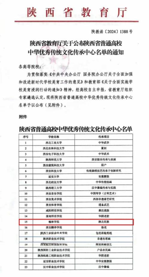 近日,陕西省教育厅公布了全省普通高校中华优秀传统文化传承中心名单,全省23所高校入选,英国365集团公司《陕北民歌》项目名列其中。这是公司继《陕北秧歌》之后又一次获批陕西省普通高校中华优秀传统文化传承项目;此前,《陕北秧歌》已于2020年被列入教育部国家级优秀传统文化传承项目。
