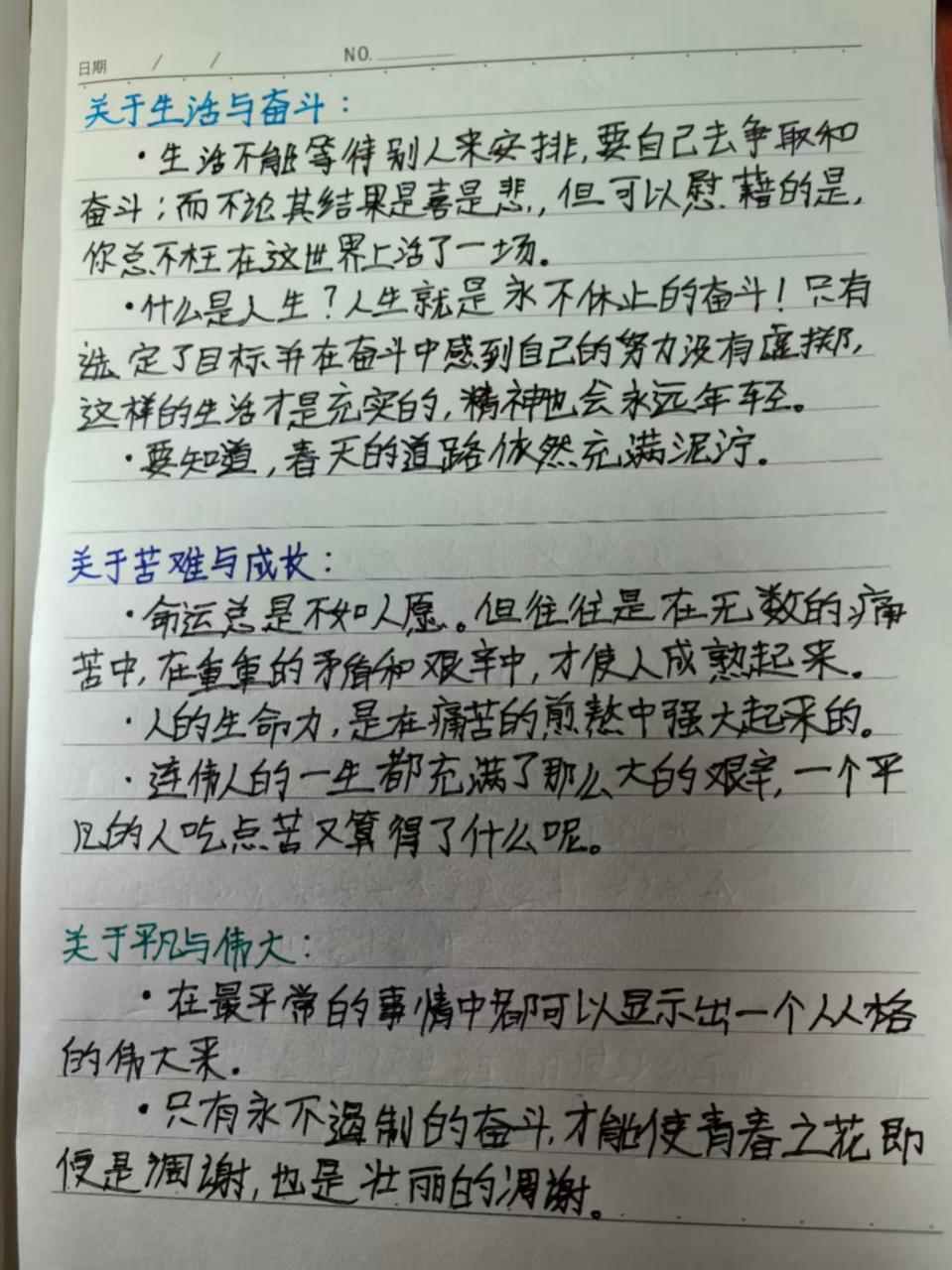 2. 经典摘抄:“毒刑拷打是太小的考验,竹签子是竹做的,共产党员的意志是钢铁铸成的。”展现了江姐的坚韧与忠诚;“她渐渐地又仿佛看见雾海之外,有无数红旗在广阔的原野上招展,一眼望不尽的武装的农民,正出没在群山之间。”体现了江姐对革命胜利和美好生活的坚定信念。