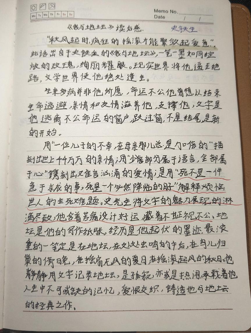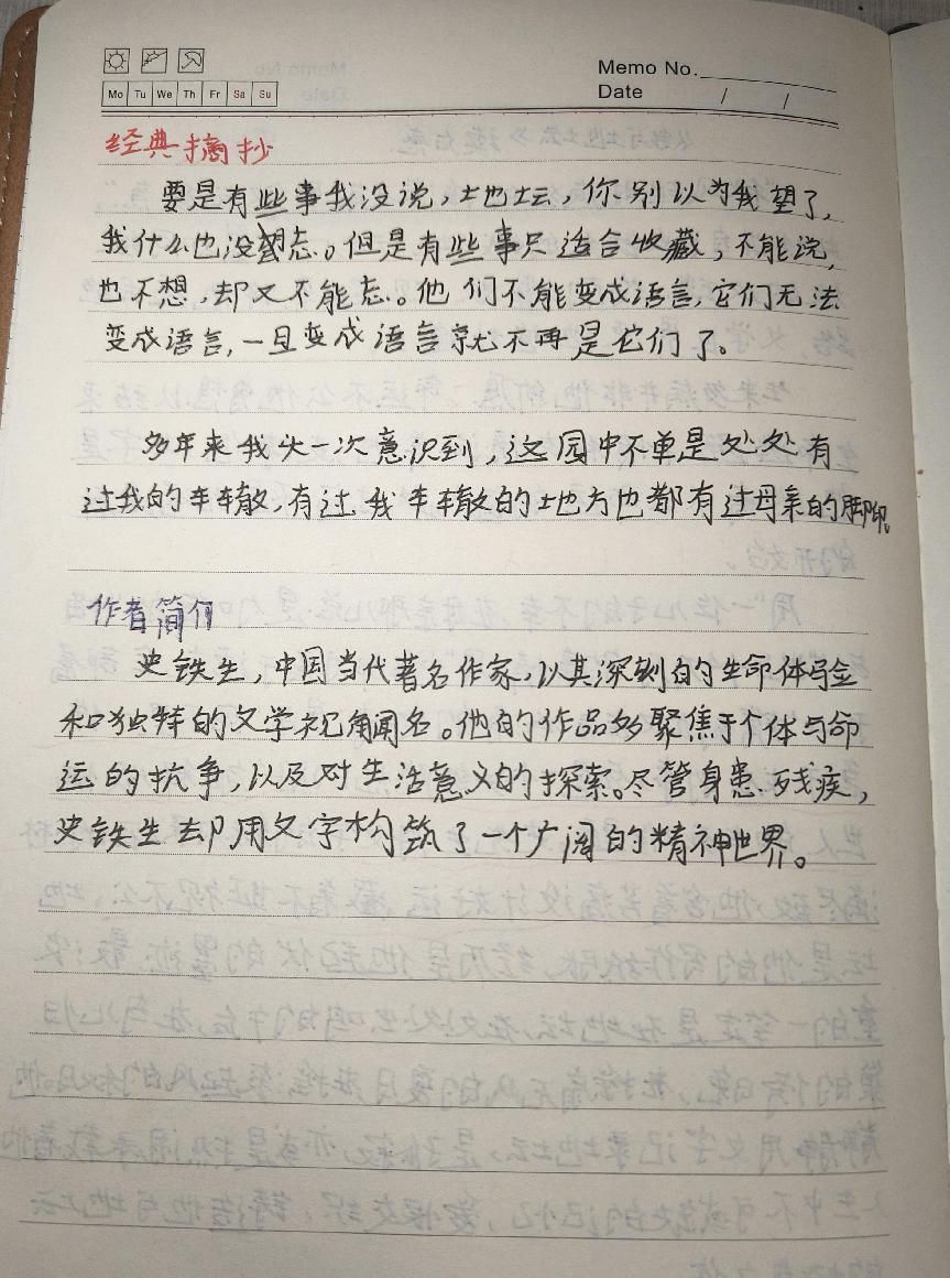 “要是有些事我没说,地坛,你别以为我忘了,我什么也没忘。但是有些事只适合收藏,不能说也不想说,却又不能忘。它们不能变成语言,一旦变成语言就不再是它们了。”“多年来我头一次意识到,这园中不单是处处有过我的车辙,有过我脚印的地方也都有过母亲的脚印。”这些文字饱含深情,令人动容。