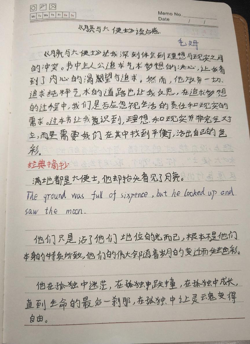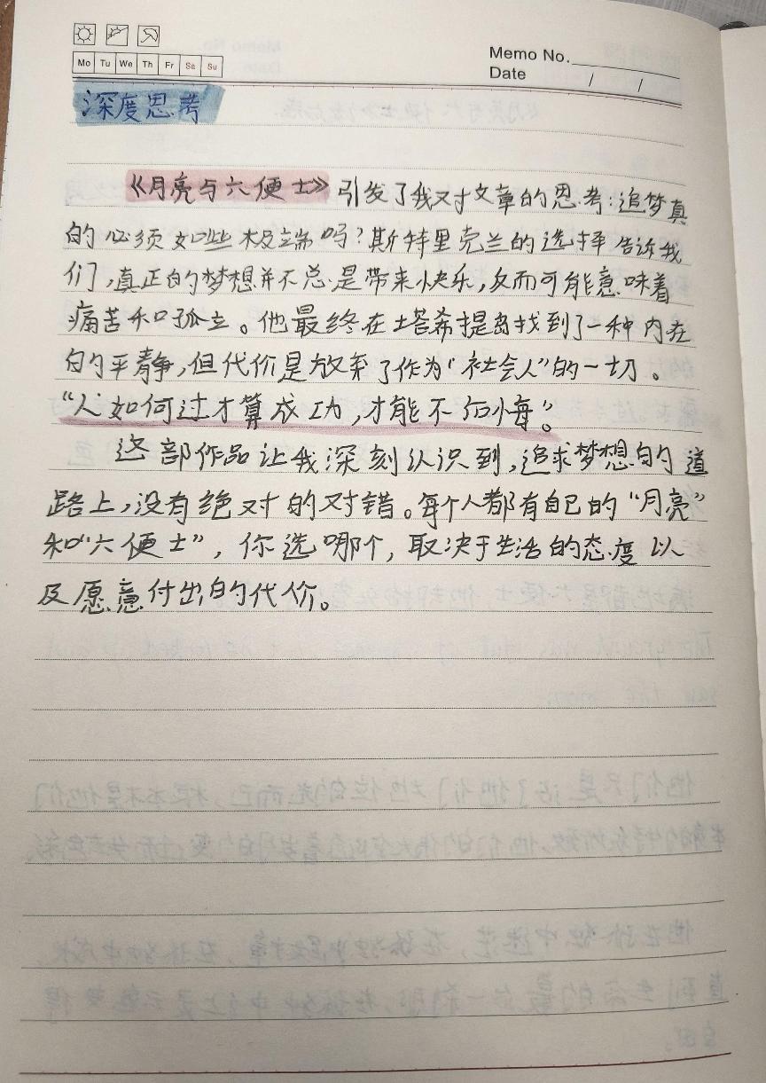 这部作品引发了我对梦想的深刻思考:追梦之路是否必然如此极端?主人公斯特里克兰德的选择表明,真正的梦想并非总是带来快乐,还可能伴随着痛苦与孤独。他在塔希提岛找到了内心的平静,却放弃了作为“社会人”的一切。这使我认识到,在追求梦想的道路上,没有绝对的对错,每个人都有自己的“月亮”与“六便士”,如何抉择取决于个人的生活态度和愿意付出的代价 。