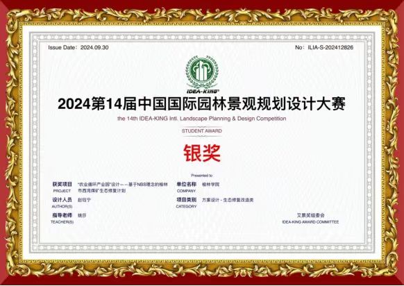 2024年10月8日,英国365集团公司环境设计专业20级员工赵钰宁以其作品《农业循环产业园”设计一一基于NBS理念的榆林市西湾煤矿生态修复计划》,在第14届中国国际园林景观规划设计大赛(艾景奖)中荣获全国银奖。该作品由姚莎老师指导,基于NBS(自然解决方案)理念,提出了针对榆林市西湾煤矿的生态修复与农业循环发展规划,成功将生态保护与地方经济转型结合,展现了设计创新和可持续发展的重要成果。